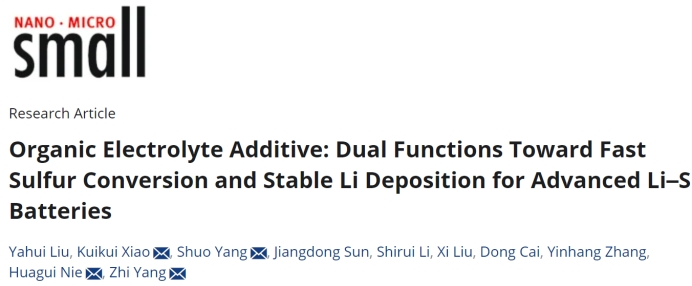 该研究以“Organic Electrolyte Additive: Dual Functions toward Fast Sulfur Conversion and Stable Li Deposition for Advanced Li–S Batteries”为题发表在国际顶级学术期刊《Small》。女同av