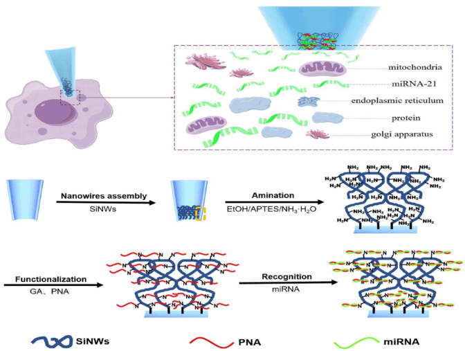 图1. SiNWs@GMT传感器用于超灵敏检测miRNA-21的示意图。