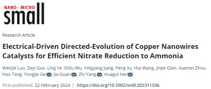 相关研究成果以《Electrical-Driven Directed-Evolution of Copper Nanowires Catalysts for Efficient Nitrate Reduction to Ammonia》为题发表在国际著名期刊《Small》(IF:13.3)上。女同av