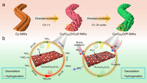 铜基催化剂定向进化及对NO3RR促进作用的示意图
