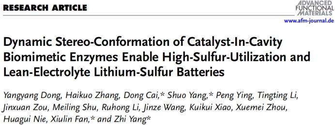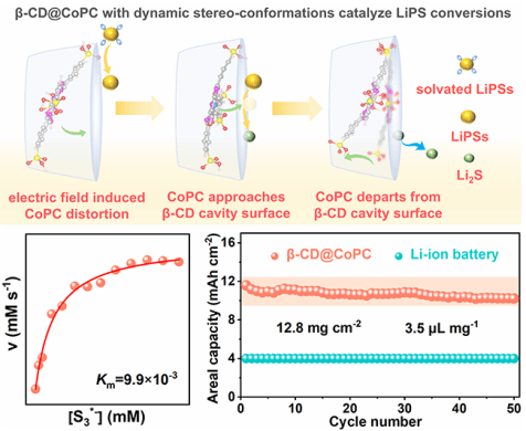 近日,我院杨植教授团队联合浙江大学的范修林教授,在国际知名期刊Advanced Function Materials上发表题为“Dynamic stereo-conformation of catalyst-in-cavity biomimetic enzymes enable high-sulfur-utilization and lean-electrolyte lithium-sulfur batteries”的文章。该工作,受启发于天然酶结构中各组分的协同作用,巧妙将磺化钴酞菁(CoPC)催化中心植入β-环糊精(β-CD)腔中,在硫正极中高精度地构筑了仿生酶催化剂(β-CD@CoPC)。这种多功能的β-CD@CoPC催化剂显著提高了贫电解质锂硫电池的硫氧化还原活性,同时加速了放电产物Li2S在催化剂表面的解离。结果表明,具有β-CD@CoP仿生催化剂的Li−S软包电池实现了优异的电化学性能。通过多种半原位/原位实验手段系统地确定了电化学性能改进的根源。更重要的是,通过拟合米氏方程确定了米凯利斯常数(Km)是锂硫电池仿生酶催化活性的关键描述符,有助于快速、高效地筛选Li-S电池催化剂。