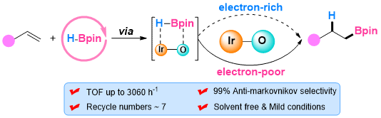 其次,他们创新性地提出了一种通过控制Ir SA催化剂中Ir-O配位键的电子构型来显著提高烯烃硼氢化反应的有效的策略。通过Ni2+空位缺陷的稳定作用,在形貌和尺寸相近的Ni(OH)x和NiOx载体上构建了两种具有Ir-O配位键的Ir SA催化剂。一系列表征证明了Ir1/Ni(OH)x中的Ir-O配位键与Ir1/NiOx相比具有更低的电子密度,因此其氧化性更强。研究发现,在无溶剂条件下的烯烃反马氏硼氢化反应中,具有贫电子特性的Ir-O配位键使得Ir1/Ni(OH)x能够在温和的条件(环境温度、Air、20 min)达到3060 h-1的优异转化频率(TOF)值,是Ir1/NiOx的72倍,远远优于传统的多相Ir纳米催化剂和均相Ir催化剂。结合机理研究和化学计算分析进一步揭示了Ir1/Ni(OH)x优异的活性源于其中存在的贫电子Ir-O配位键的强氧化作用,可使H-B(OR)2的B-H键更有效地断裂,从而使烯烃的硼氢化反应以更低的能垒顺利进行。这项工作将为改变SA催化剂中配位键的性质以优化其性能提供新的线索,并为开发出性能更好的异相催化剂以用于均相有机反应的异相化提供思路。此项工作以《Electron Deficient Ir-O Bonds Promote Heterogeneous Ir-Catalyzed Anti-Markovnikov Hydroboration of Alkenes under Mild Neat Conditions》为题发表在《Nano Letters》上,女同av