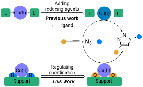 最后,张剑课题组还开发出一种新的合成策略,通过构建具有N和O配位的SA Cu (II)催化剂可以在没有还原剂的情况下顺利实现直接叠氮化物-炔烃点击化学。以密度泛函理论( DFT )计算分析不同Cu (II)中心上Cu-炔中间体的形成难易为指导,通过有机分子辅助法在碳包覆的Al2O3上合成了具有O和N配位的SA Cu (II)催化剂。尽管Cu的氧化态都接近+2,但O配位的SA Cu (II)催化剂对叠氮-炔烃环加成的活性比N配位的高5倍,同时具有良好的可回收性和底物适应性。进一步的EPR探究证明了炔烃底物更容易还原O配位而非N配位的SA Cu(II)中心,这与DFT计算得出的结论一致,也解释了点击反应活性提高的原因。这项工作拓展了固载化Cu (Ⅱ)催化体系在点击化学中的应用,为克服非均相催化的障碍,开发性能更好的非均相催化体系提供了新的指导。此项工作以《Oxygen Coordination Promotes Single-Atom Cu(II)-Catalyzed Azid−Alkyne Click Chemistry without Reducing Agents》为题近期发表在《ACS Applied Materials & Interfaces》上,女同av