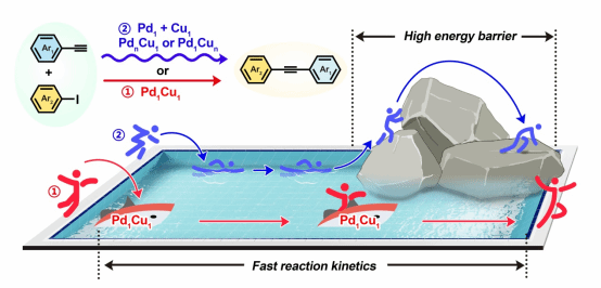 首先,他们开发出了一种简便的蛋白质包覆策略,利用牛血清白蛋白中分布均匀的丰富的氨基和羧基,使得Cu和Pd前驱体在适当的距离上均匀分散,热解后形成的碳材料中掺杂的N和O为Cu和Pd原子提供锚定位点,在棒状氧化铝上成功制备了处于拥挤状态的Pd和Cu单原子。该制备方法操作简单,对于金属前驱体和载体材料没有特殊要求。所制得的催化剂在Sonogashira 偶联反应中表现出优异的活性,其TOF值为313 h-1,显著高于常规“半均相”催化剂Pd/C和CuI、含Pd和Cu纳米颗粒的多相催化剂以及Pd和Cu单原子混合催化剂。此外,它还在回收测试中表现出良好的催化稳定性。理论研究证明带正电荷的Pd和Cu单原子中心在芳基卤化物和炔烃的活化中具有显著的优势,且它们之前的空间距离较近,明显有利于形成的乙炔基中间体的金属化过程,从而大大提高了Pd1Cu1/NOC/Al2O3在Sonogashira 偶联反应中的催化活性。这项工作不仅为高效构建具有多个相邻活性中心的高性能非均相催化剂提供了重要线索,而且为实现多个活性中心共同催化的高效有价值的有机转化提供了新的指导。此项工作以《Constructing Pd and Cu Crowding Single Atoms by Protein Confinement to Promote Sonogashira Reaction》为题近期发表在 《Adavanced Meterials》上,女同av