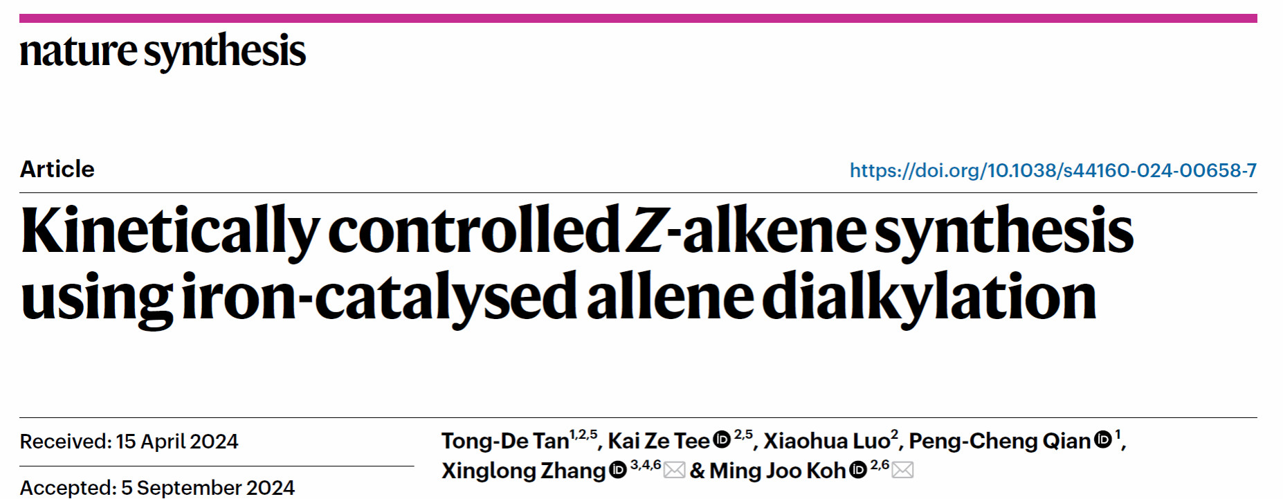 近日,我校钱鹏程教授课题组与新加坡国立大学Ming Joo Koh教授课题组,香港中文大学章兴龙助理教授合作报道了铁催化联烯、二烷基锌化合物和卤代烷烃的多组分反应,以优异的区域选择性和Z-选择性构建了一系列三取代烯烃,包括葡萄糖神经酰胺合成酶(GCS)抑制剂。机理研究表明该反应是由动力学控制的(即自由基介导位阻较小C=C键的铁烷基化和通过还原消除进行的内球烷基化),这与金属催化联烯官能团化反应的传统机制形成鲜明对比。
