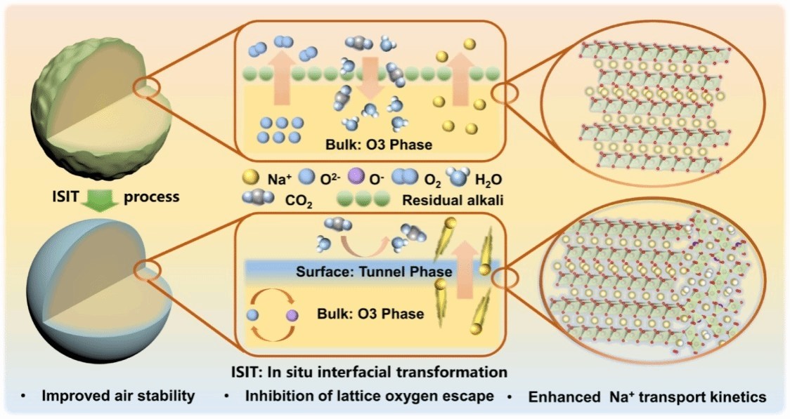 层状氧化物正极的应用受到空气稳定性差、表面残碱严重和晶格氧逃逸的限制。由于空气中H2O的嵌入以及离子交换和CO2的加速作用,会导致氧化物正极表面残碱的产生和结构破坏,从而正极材料失效。此外,不可逆的相变和缓慢晶格氧动力学会也会对电池综合性能产生不利影响。因此,提高空气和结构稳定性对于氧化物正极的实用化至关重要。