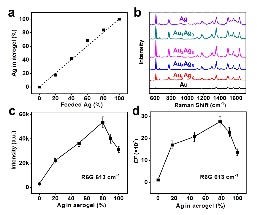 (c-d)拉曼强度(c)和EFs(d)随Ag在气凝胶中比例变化而变化的趋势图。