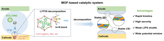 图1. FePC@NH2-MIL-68仿生催化剂在锂硫电池正负极中的作用机理。