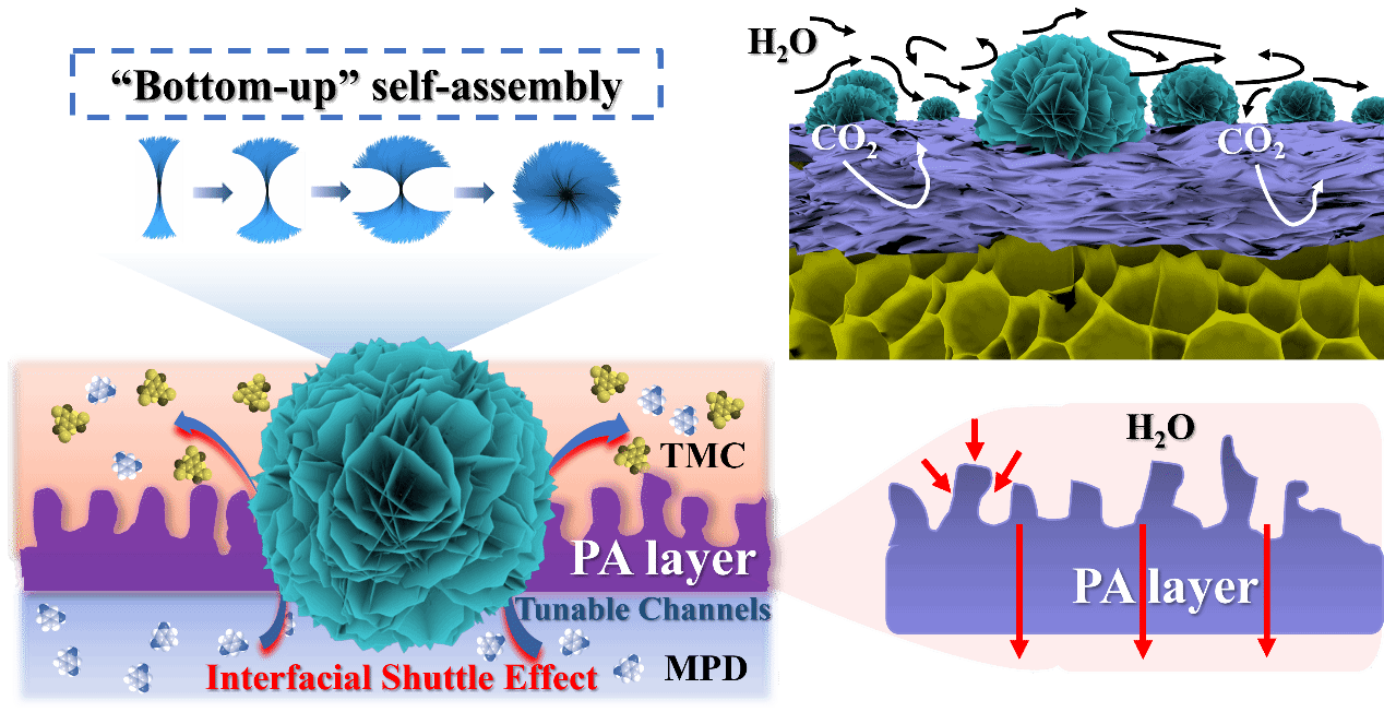 针对上述问题,我院薛立新研究员联合浙江工业大学黄菲教授开发了一种基于自组装纳米花(P(AA-I)-NFs)的薄膜纳米复合(TFN)全热交换膜。研究中,通过精准调控纳米花的层内与层间孔道,提出了一种全新的界面聚合策略,引入“界面穿梭效应”来优化聚合反应深度和活性层形貌。与传统聚酰胺薄膜相比,该膜显著提高了表面粗糙度和厚度,展现出更优异的水汽渗透性(656.59 GPU)、焓交换效率(71.47%)和CO₂阻隔性能(0.51 GPU)。这项研究成果突破了传统材料的性能权衡,为下一代高效节能新风系统关键膜材料研发的提供新思路。