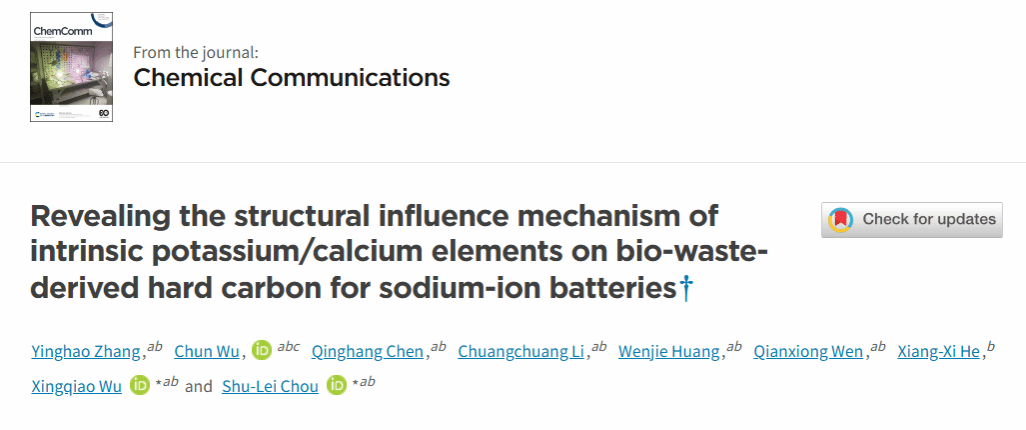 该成果以“Revealing the structural influence mechanism of intrinsic potassium/calcium elements on bio-waste-derived hard carbon for sodium-ion batteries”为题,发表在Chemical Communications上。我院2022级硕士生张颖豪为论文第一作者,侴术雷教授、吴星樵博士为该论文共同通讯作者,女同av