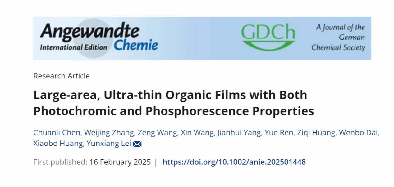 该论文以“Large-area, Ultra-thin Organic Films with Both Photochromic and Phosphorescence Properties”为题发表于国际顶级期刊⟪Angew. Chem. Int. Ed.⟫上。我院23级博士生陈川力为第一作者,西安现代化学研究所张玮经博士为共同第一作者。我院雷云祥特聘教授、黄小波教授、以及淮北师范大学任悦副教授为共同通讯作者,相关工作得到了国家自然科学基金的支持。