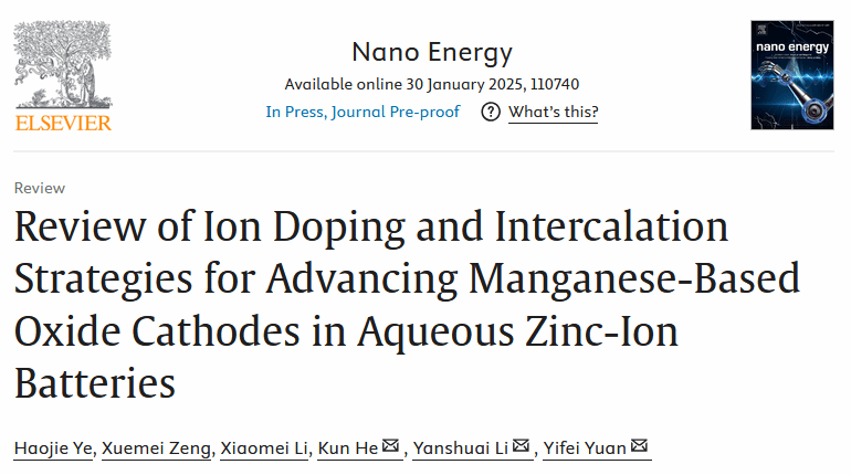 该综述论文以“Review of ion doping and intercalation strategies for advancing manganese-based oxide cathodes in aqueous zinc-ion batteries”为题发表于纳米能源领域国际顶级期刊⟪ Nano Energy ⟫(IF=16.8,中科院一区)。女同av