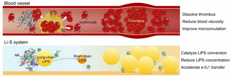 近日,受纳豆激酶(NK)溶解血栓和改善血液微循环功能的启发,我校杨植教授、杨硕副教授团队与中国科学技术大学江俊教授团队联合开发了一种高效的多硫离子转化仿生酶用于碳纳米管负载硫正极——NK及其肽基模拟酶(丝氨酸-组氨酸-天冬氨酸三联体活性中心,Ser-His-Asp)。密度泛函理论计算、原位光谱和电化学分析,揭示了其独特的催化机制:天冬氨酸(Asp)强电负吸附固定LiPSs,丝氨酸(Ser)电子轴拉伸催化S-S键断裂,组氨酸(His)亲锂位点促进电荷/Li⁺传输。通过机器学习优化配方,该催化剂显著提升了贫电解液条件下的SRR动力学,实现高倍率容量(744 mAh g⁻¹,5 C)、长循环寿命(250圈容量衰减率0.096 %)和高面积容量(8.87 mAh cm⁻²,E/S=4 μL mg⁻¹)。这一研究结果从生物酶到电化学,跨界创新,重新定义了锂硫电池催化的未来。