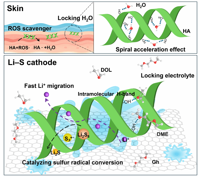 近日,受到天然保湿材料解决人体皮肤缺水问题的启发,我校杨植教授、杨硕副教授与济南大学刘浩博士合作,提出一种创新性策略:将天然保湿材料——透明质酸HA作为催化剂引入硫阴极,实现高性能锂硫电池。实验和分子动力学模拟结果表明,HA可以通过其双螺旋结构中的分子内氢键牢牢的吸附电解液,确保电解液与电极表面充分接触,营造局部电解液充足的反应微环境;同时,HA的N位点能够吸附并催化多硫化物的可逆转化;此外,HA独特的双螺旋结构凭借螺旋加速效应促进了Li+的传输。在三重协同作用下,电池性能得到显著提高。CNT−S/HA阴极(约80 wt%硫含量)表现出良好的初始容量、高倍率性能以及长循环寿命。特别是在硫负载为8 mg cm−2、E/S比为3 μL mg−1的贫电解液条件下,锂硫软包电池实现了11.76 mAh cm−2的高面积容量,能量密度达到409 Wh kg−1。此外,1.5 Ah软包电池可驱动无人机续航20分钟,续航时间远超传统锂电池约4倍。该工作为开发天然保湿材料在下一代储能设备中的应用开辟了创新途径。