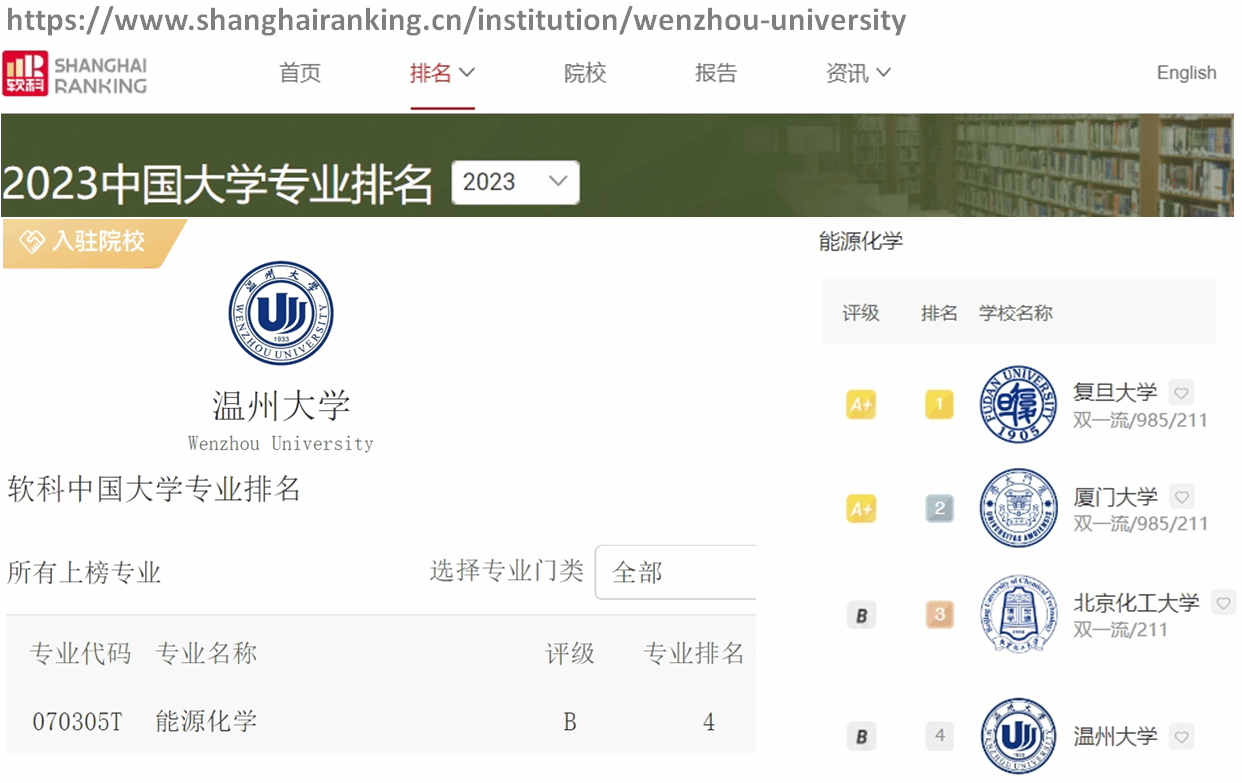 能源化学专业面向国家新能源产业重大战略发展需求,于2020年获教育部批准建立的新兴热门专业,依托化学一级学科博士学位授权点、化学和材料科学与工程两个国家一流本科专业建设点及一级学科硕士学位授权点,拥有能源化学领域雄厚师资和完备科研创新训练平台,是国内创办该专业的第五所本科高校、浙江省本科高校首设专业,在2023年软科中国大学专业排名中位列第四名。