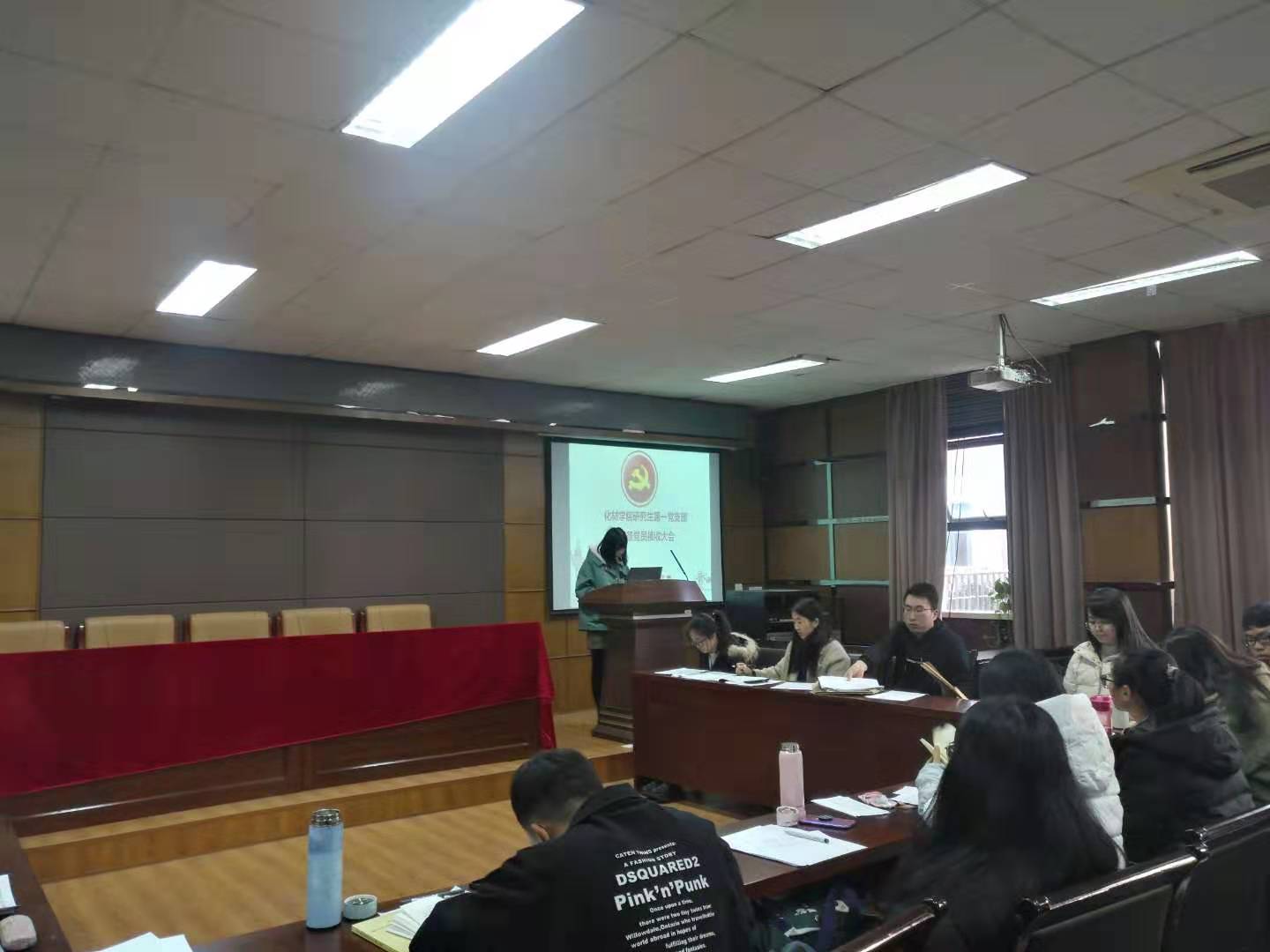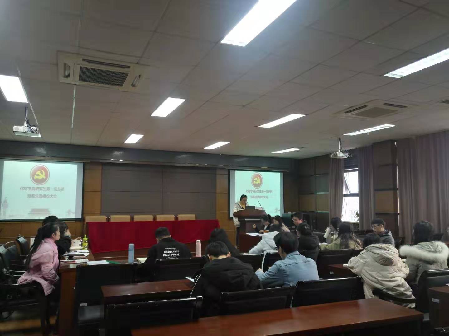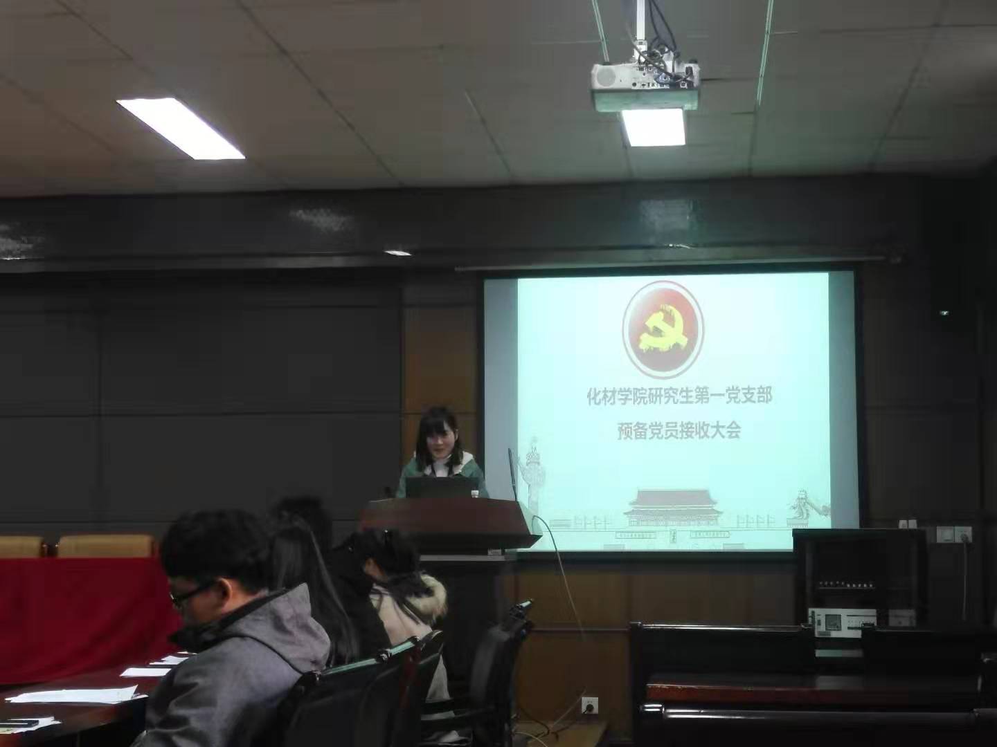 研究生第一党支部接收预备党员大会在化材楼11B 208会议室举行。本次会议由支部书记祝精燕同志主持。