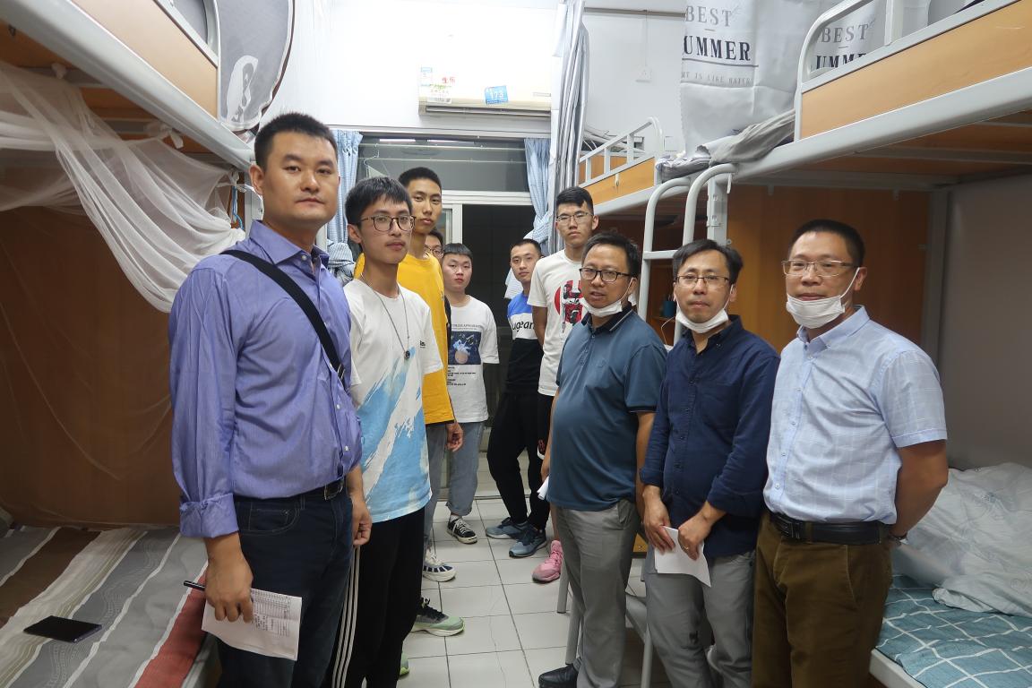 领导、辅导员、班主任、新生班主任助理、学生会成员在华表前学院帐篷集合后,分成五支队伍去2020级新生寝室走访。