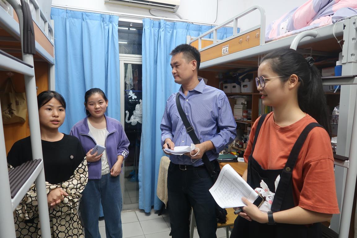 在走访各新生寝室的过程中,老师们对新生的寝室环境、校园适应等方面进行了亲切的询问,表示了充分的关心。老师们耐心解答新生提出的各方面问题,主动了解新生的家乡,鼓励新生珍惜大学时光,做好大学规划,重视专业知识的学习和技能的掌握。同时,老师们和班助们多次提醒新生谨防诈骗,注意保护财产,树立防骗意识和安全意识。学生会成员分享了在班委竞选等方面的经验,鼓励新生大胆锻炼自身,多多发掘自身的才能。