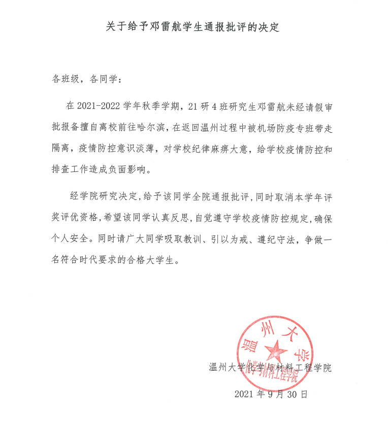 关于给予邓雷航学生通报批评的决定