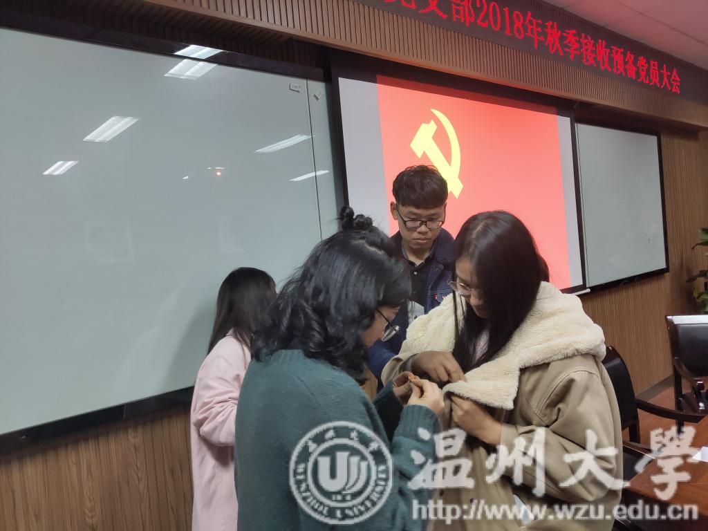 会议历时三个小时,会上讨论气氛热烈,批评与自我批评真诚、深刻。经到会的有表决权的正式党员对4名同志的入党问题讨论、逐一无记名票决后,大会通过吸收4名发展对象加入中国共产党,会后将进行公示并报上级党组织审查。党支部委员会对新吸收的党员表示祝贺与欢迎,督促全体学生党员要自觉用共产党员标准要求自己,不忘入党初心,用实际行动诠释共产党员的先锋模范引领价值。会议最后,支部书记为新党员佩戴党员徽章,新老党员在党旗前庄严宣誓,共同重温入党誓词,牢记入党初心。