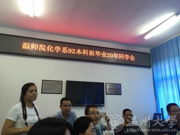 2016年7月30日,温州师范学院化学系92级本科班毕业20周年同学会在女同av 学院路校区举行。 炎炎夏日,挡不住大家相聚的热情。上午,来自四面八方的同学热情拥抱,相互问好,好多同学还真是毕业后一直没有见面。万幸,同学们都还依然年轻,老师们都还依然健康。座谈会上,张力学老师竟然完全默写出全体同学的姓名,还兴致勃勃的回忆起当年入党的同学情况、英语四六级过关情况和考研情况等,大家非常钦佩张老师的超人记忆力。座谈会上还邀请了吴国炘老师、叶芳尘老师、叶忠老师和张卫兵老师,大家一起回忆当时的就学情况,其中不乏一些趣事和糗事,现场气氛十分浓烈。由于特殊原因,班主任程亚倩老师未能出席同学会,得益于先进的通讯技术,现场视频留言、交流,好像就在我们身边,完美的一幕将气氛推向高潮。 座谈会后,由乐清同学安排,他们移师乐清雁荡,在那里继续欢庆毕业20周年活动。